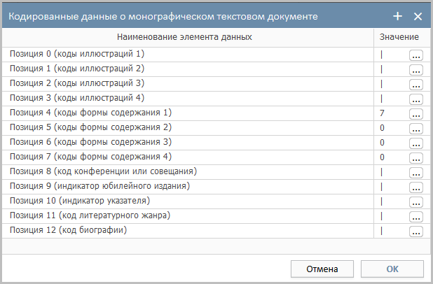 . На экране появится окно "Кодированные данные о монографическом текстовом документе".