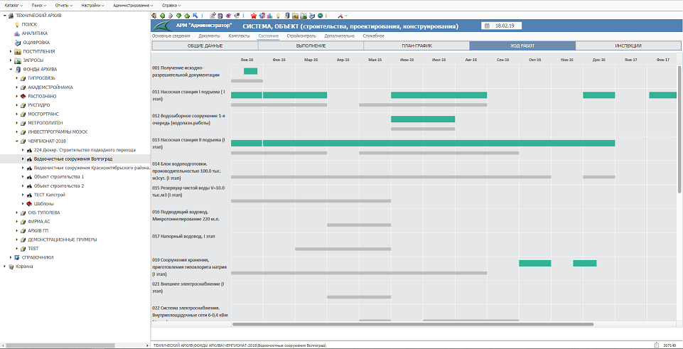 Ниже приведён пример построения диаграммы Ганта. В левой части диаграммы находятся заголовки - <Код><Вид работ>. На графике зелёным цветом выделен фактический период и серым цветом плановый период. При наведении курсора мыши на выделенную область можно увидеть данные из параметров – Фактическая стоимость, фактический объём и Плановая стоимость.