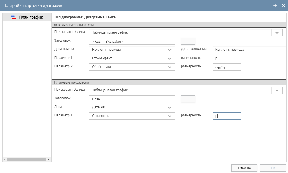 В первой части настроек диаграммы рассматривается фактическое исполнение плана. Во второй части настроек можно указать данные плановых показателей для сравнения с данными в первой части: