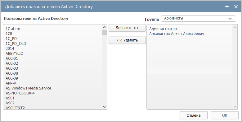 - Внимание! Кнопка "Удалить" активна только для тех пользователей, которые были ранее добавлены из Active Directory. Используя кнопку "Удалить" в окне "Добавить пользователя из Active Directory", невозможно удалить учетные записи пользователей, ранее созданные в программе.