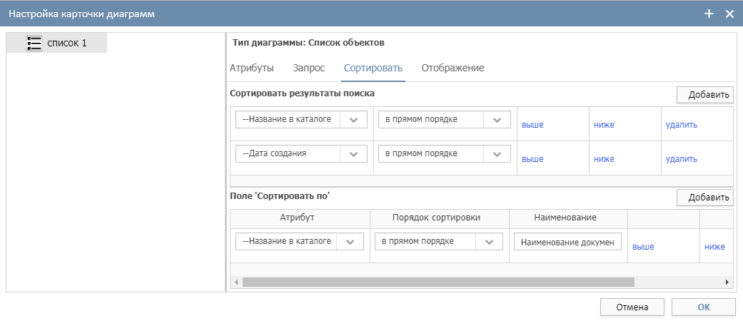 В таблице "Сортировать результаты поиска" можно указать столбцы, по которым будет проводиться сортировка при загрузке данных в список объектов. Для этого нажмите на кнопку "Добавить" и в появившейся строке выберите параметр списка, по которому должна производиться сортировка.