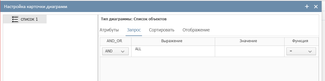 Далее необходимо перейти на вкладку "Запрос" и создать запрос, чтобы выбрать из набора объектов указанных типов, те объекты, которые требуются в списке. Подробнее описание способов создания запросов в разделе "Настройка состава столбцов, сортировки, группировки".