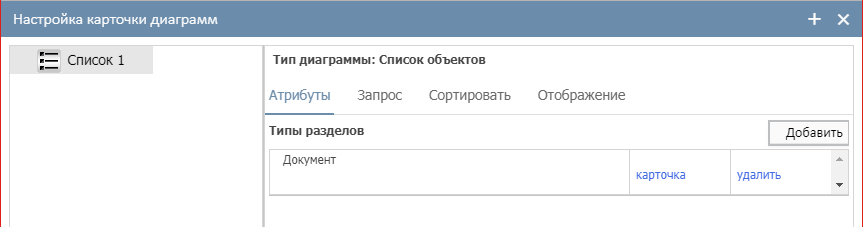 Чтобы выбрать объекты, которые должны отображаться в создаваемом списке необходимо в окне настройке карточки диаграмм на вкладке "Атрибуты" нажать на кнопку "Добавить". Далее в открывшемся окне выбрать нужные типы объектов (типов объектов может быть несколько).