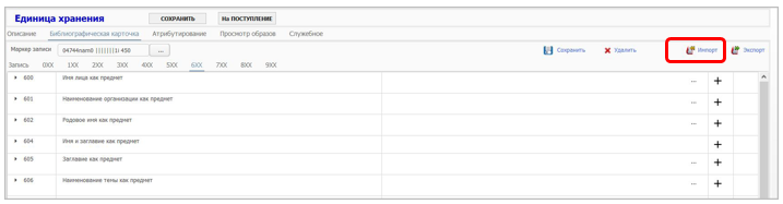 - Для загрузки (импорта) библиографического описания формата RUSMARC нажмите кнопку "Импорт".