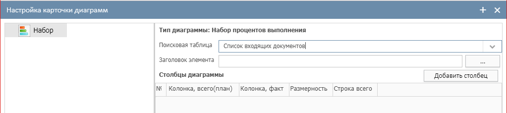 Чтобы создать диаграмму, необходимо выбрать поисковую таблицу из выпадающего списка. При необходимости можно указать заголовок элемента, который будет отображаться в верхней части каждого элемента диаграммы. Далее нужно нажать на кнопку "Добавить столбец" и ввести следующие данные: