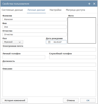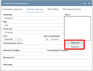 - Поля "Дата рождения", "Электронная почта", "Личный телефон", "Служебный телефон", "Должность", "Описание" заполните соответствующей информацией.