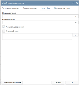 - В окне третьей вкладки "Настройки" укажите подразделение, имя руководителя, установите флажки "Рассылать уведомление" (о событиях, инициированных пользователем).